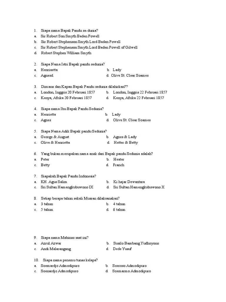Ia memiliki nama kecil gusti raden mas dorojatun. Tidak perlu lagi ada pemisahan seorang tokoh diberikan gelar "bapak pandu indonesia" Ayahnya meninggal ketika ia masih kecil. Siapa nama bapak pandu se dunia. Soal tender (10 nomor isian singkat) 1. Dengan begitu tujuan utama lembaga pramuka sendiri dapat tercapai yaitu membentuk jiwa pemuda pemudi yang bermanfaat bagi sesama manusia dimana pun dan kapan pun. Sir robert stephenson smyth lord baden powell. Ayah dari stephenson bernama baron baden powell. Sir robert stephenson smyth baden powell of gilwell. nama baden powell diambil dari nama ayahnya domine hg baden powell, seorang profesor geometri di universitas oxford. Ms (algemeen midelbare school) atau sma, jurusan sastra timur, khusus… Ia berjasa mengawali gerakan pramuka di indonesia. Sri sultan hamengkubuwono ix lahir di yogyakarta pada 12 april 1912.